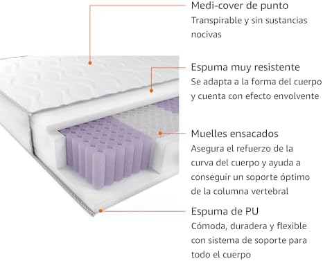 Este colchón de muelles ensacados de Amazon Basics ofrece un soporte de firmeza media (H3) con 7 zonas diferenciadas, ideal para un descanso ergonómico. Su diseño con muelles individuales minimiza la transferencia de movimiento, lo que lo hace excelente para parejas. La combinación de muelles y espumas HR, junto con una funda lavable, garantiza confort, higiene y una buena transpirabilidad.